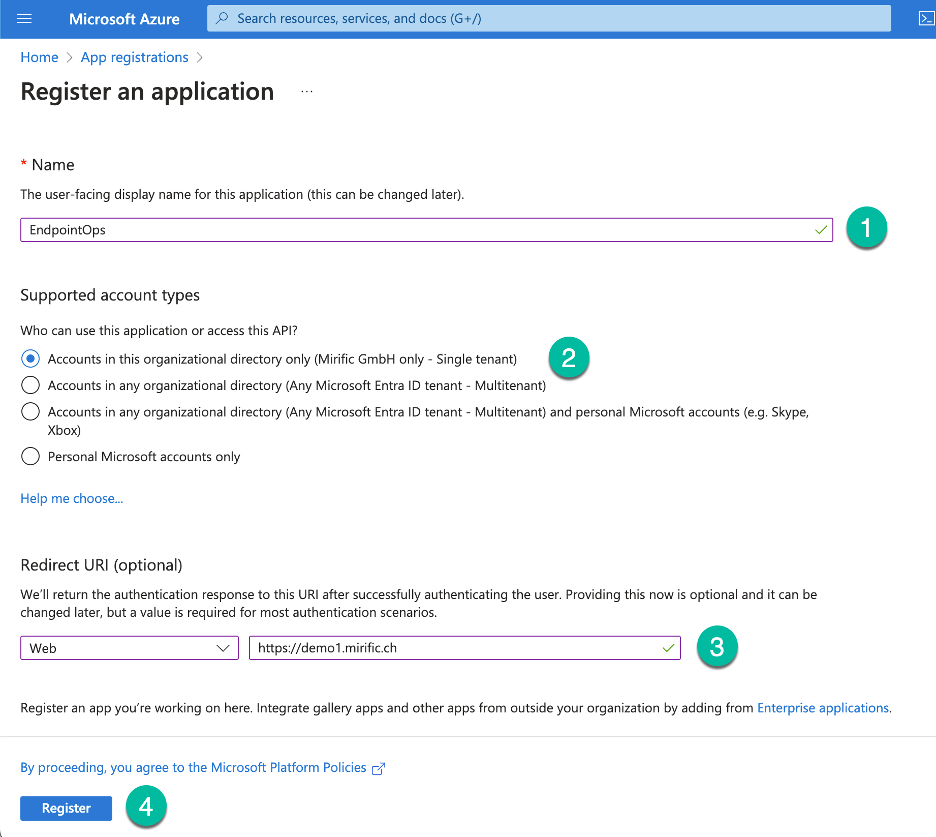 - Redirect URI: Web - https://yourOrgName.endpointops.com/signin-oidc. Please save this URL with your notes