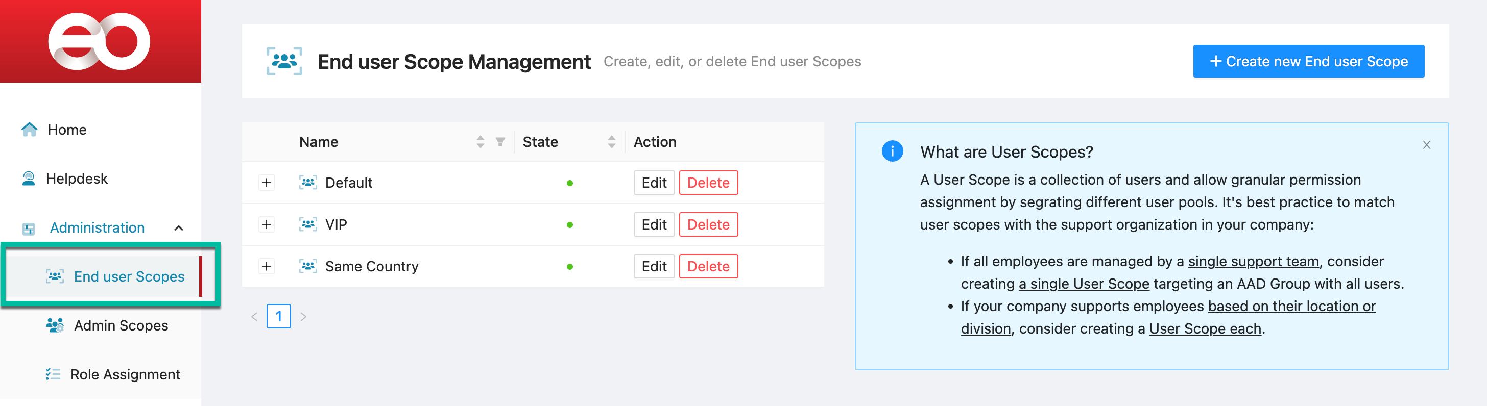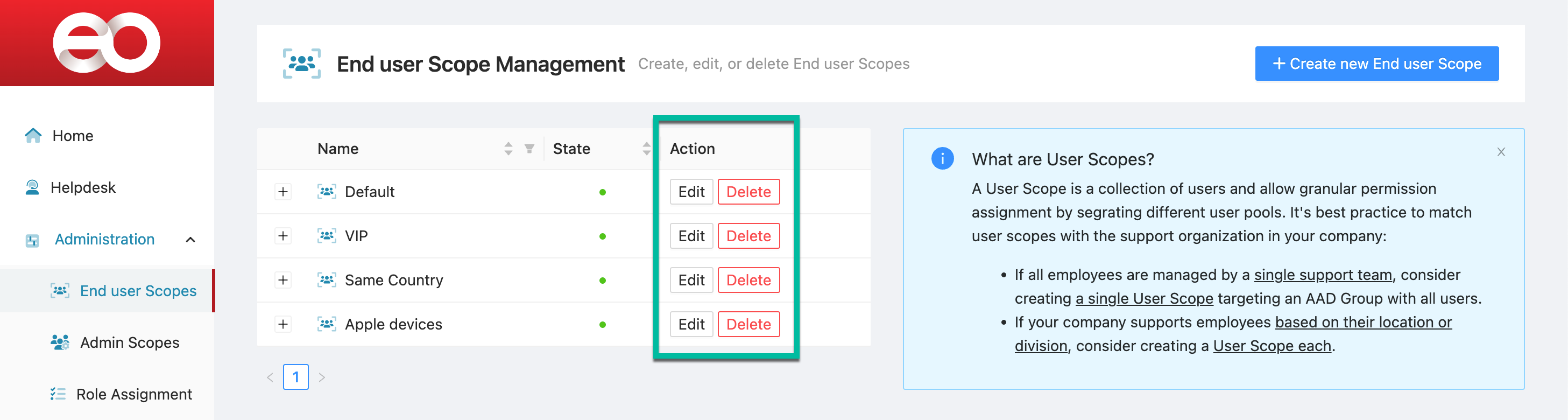 End User Scopes can be updated or deleted at any point. Simply use the Edit or Delete button on the respective End User Scope.