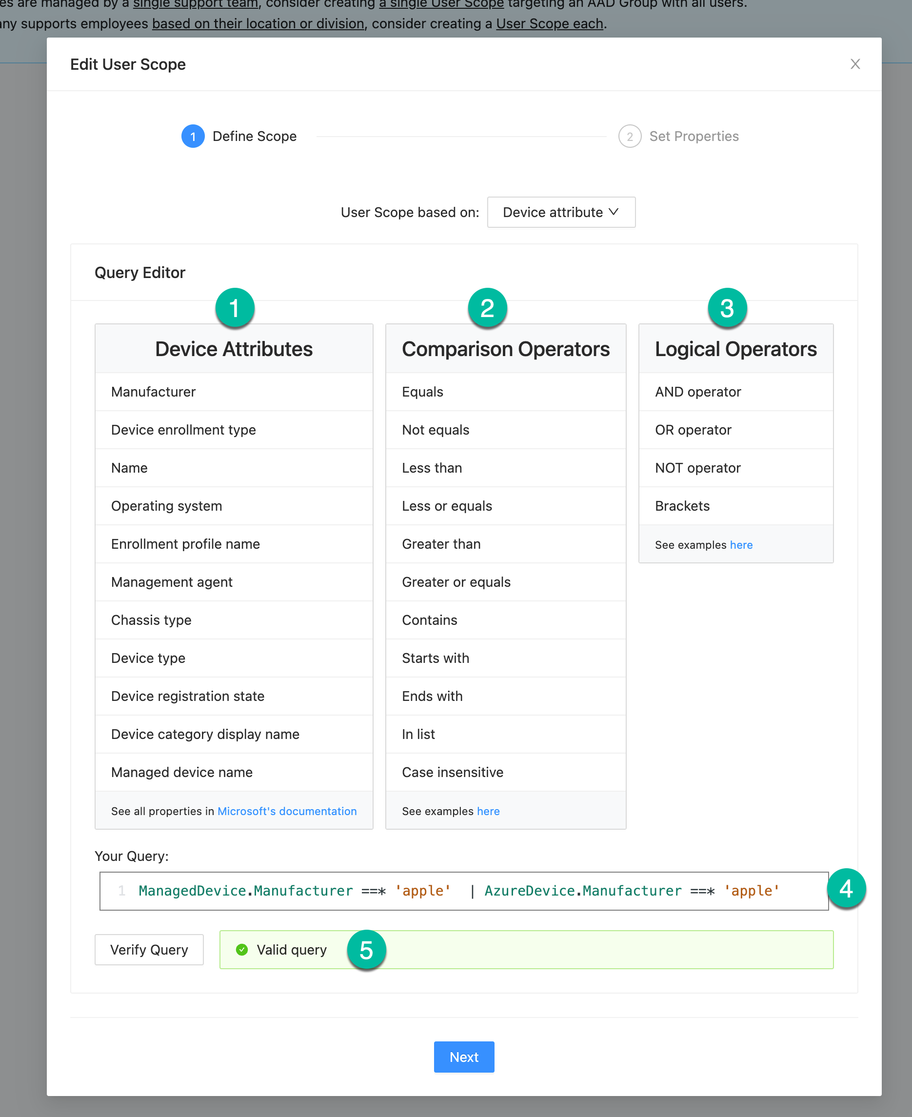 - The name of the End User Scope is visible to Helpdesk operators when searching for a user or device. Choose a unique and self explanatory name.